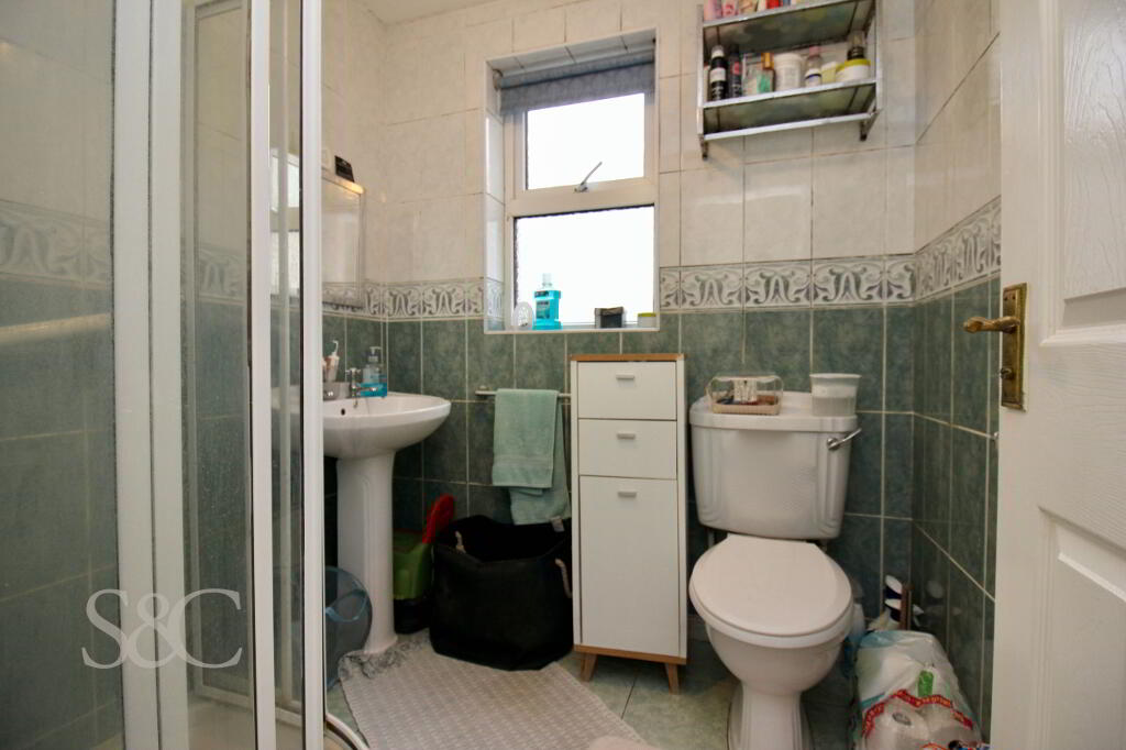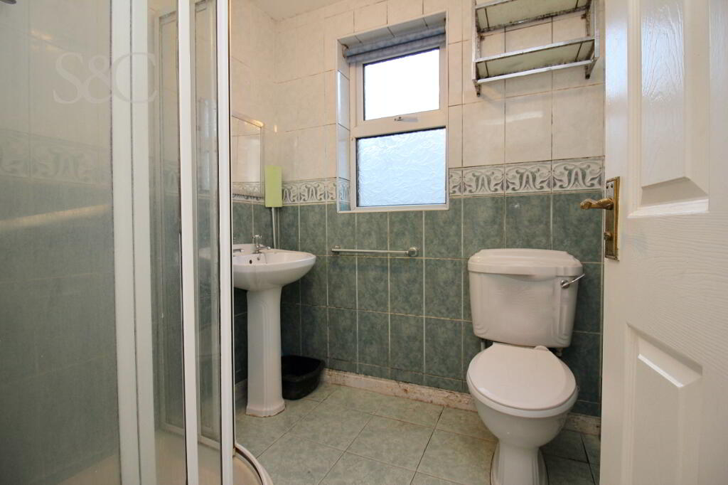 WHB, WC and Triton Corner electric Shower. Fully tiled walls & floor.