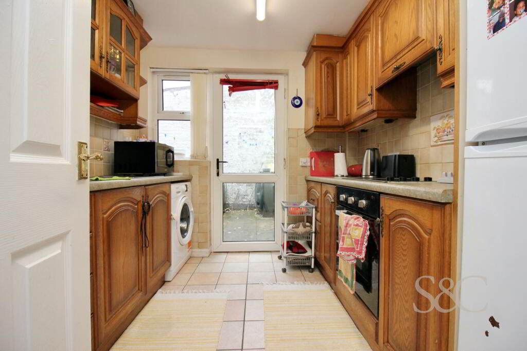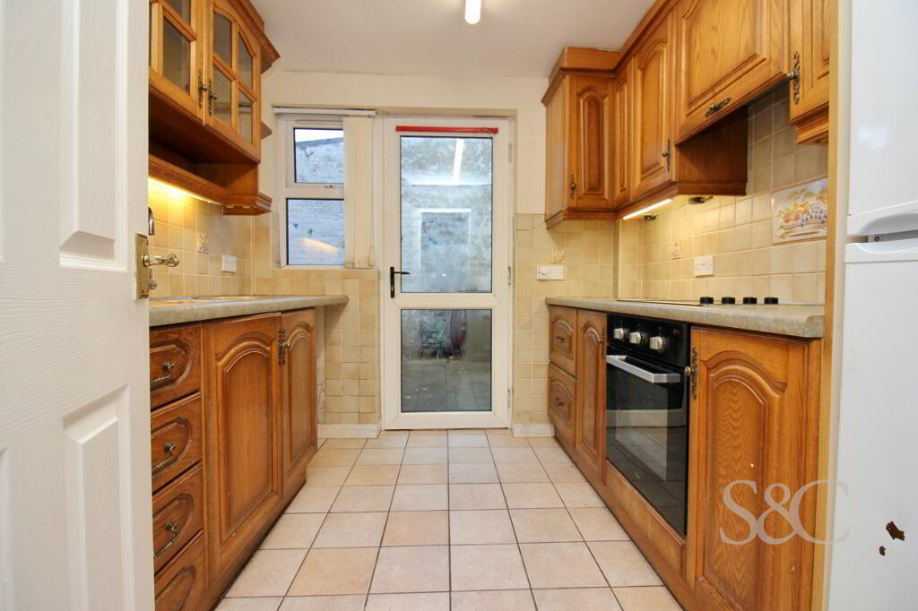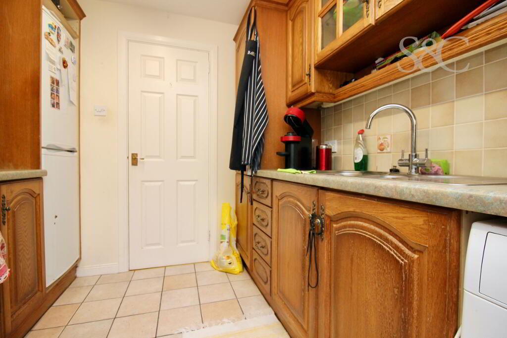 Galley style Kitchen with high & low level units. Plumbed for AWM. Electric Whirlpool oven and Electrolux cermaci hob. Space for Fridge/ Freezer. Oil burner housed within Kitchen unit. Rear uPVC door with glaze panel leads to rear of property.