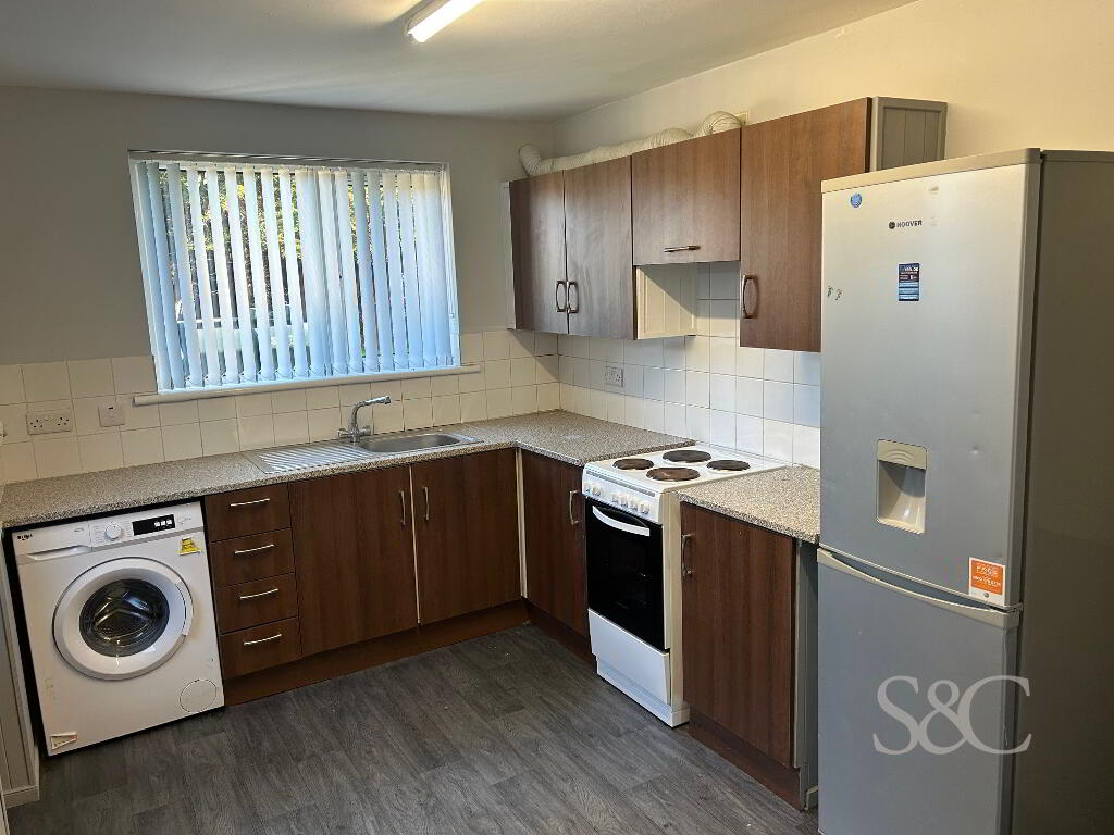 High and low level units, Electric Cooker, Washing machine, Vinyl Grey Wood Floor Window view to garden. Back door access into yard with gate at the bottom leading into shared garden. PVC door with glass panel.